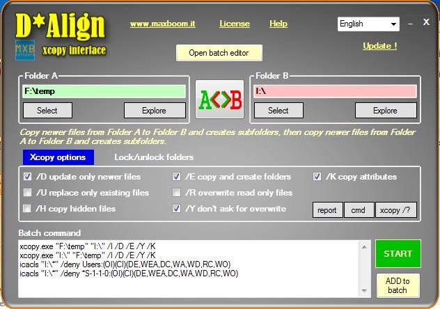 Datalign allows the alignment betweeb 2 different folders using the xcopy command. Also it is able to change the folders read/write/delete permissions with icacls command.