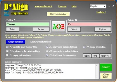 Allows the xcopy parameters customization and the editing of the final batch command.